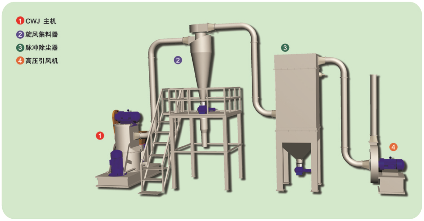 物料經(jīng)加料裝置送入粉碎室,在沖擊錘及氣流沖擊下相互碰撞、剪切、摩擦、研磨而被粉碎,粉碎后的物料在上升氣流的作用下進(jìn)入分級室進(jìn)行分級,合格后的細(xì)粉穿過分級葉輪從出料管排出后被集料器收集,不合格的細(xì)粉被分級葉輪甩出后回到粉碎室進(jìn)行重新粉碎。
