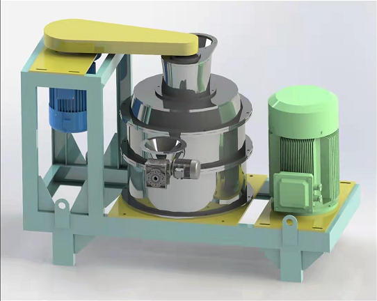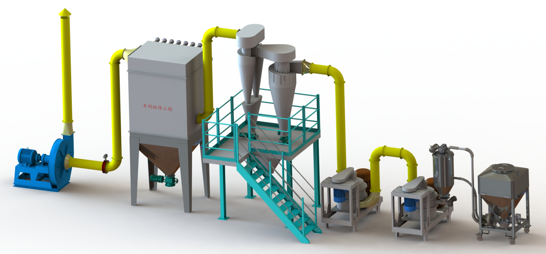 本機的機腔為圓筒形,由一環(huán)形將其分為上下兩部分,下部分為進氣室,上部分由分流環(huán)分隔成粉碎室和分級室。粉碎室將物料擊碎成細粉后進入分級室,分級室能把細粉分成粒度達標和未達標兩種規(guī)格,達標細粉經(jīng)出料管吸出,由旋風集料器收集產(chǎn)品。未達標的細粉沿分流環(huán)內(nèi)壁回落到粉碎室,繼續(xù)粉碎,直到達標為止。