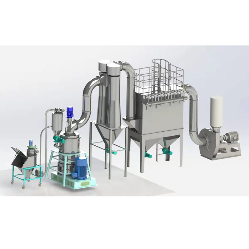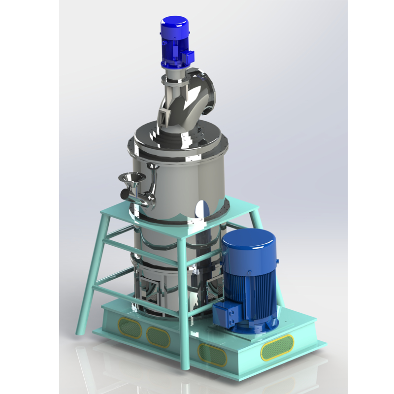 分級電機帶動分級輪旋轉,形成對粉體的分級作用。成品粒徑的大小可通過分級輪轉速的快慢進行調節。不符合要求的粗顆粒被葉片拋向外壁在重力的作用下落入研磨室繼續進行研磨,符合要求的顆粒穿過葉片隨氣流形成氣固兩相流,吸入旋風集料器內,氣流與粉體顆粒被氣固分離后,粉體顆粒被收集。