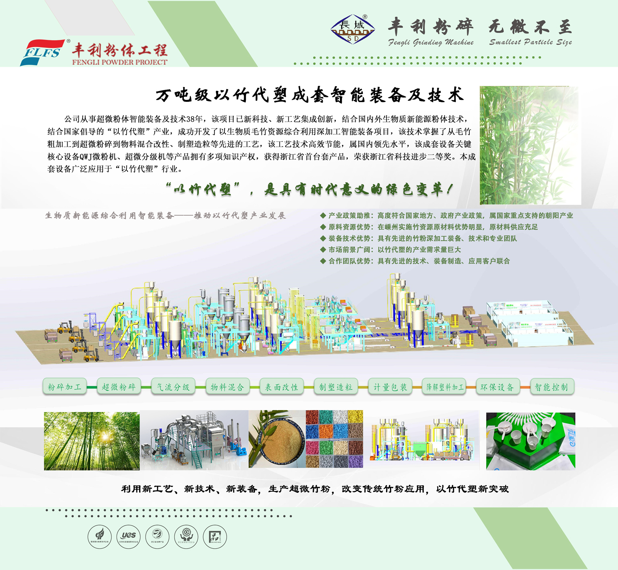 公司從事超微粉體智能裝備及技術38年,該項目已新科技、新工藝集成創新,結合國內外生物質新能源粉體技術,結合國家倡導的“以竹代塑”產業,成功開發了以生物質毛竹資源綜合利用深加工智能裝備項目,該技術掌握了從毛竹粗加工到超微粉碎到物料混合改性、制塑造粒等先進的工藝,該工藝技術高效節能,屬國內領先水平,該成套設備關鍵核心設備QWJ微粉機、超微分級機等產品擁有多項知識產權,獲得浙江省首臺套產品,榮獲浙江省科技進步二等獎。本成套設備廣泛應用于“以竹代塑”行業。